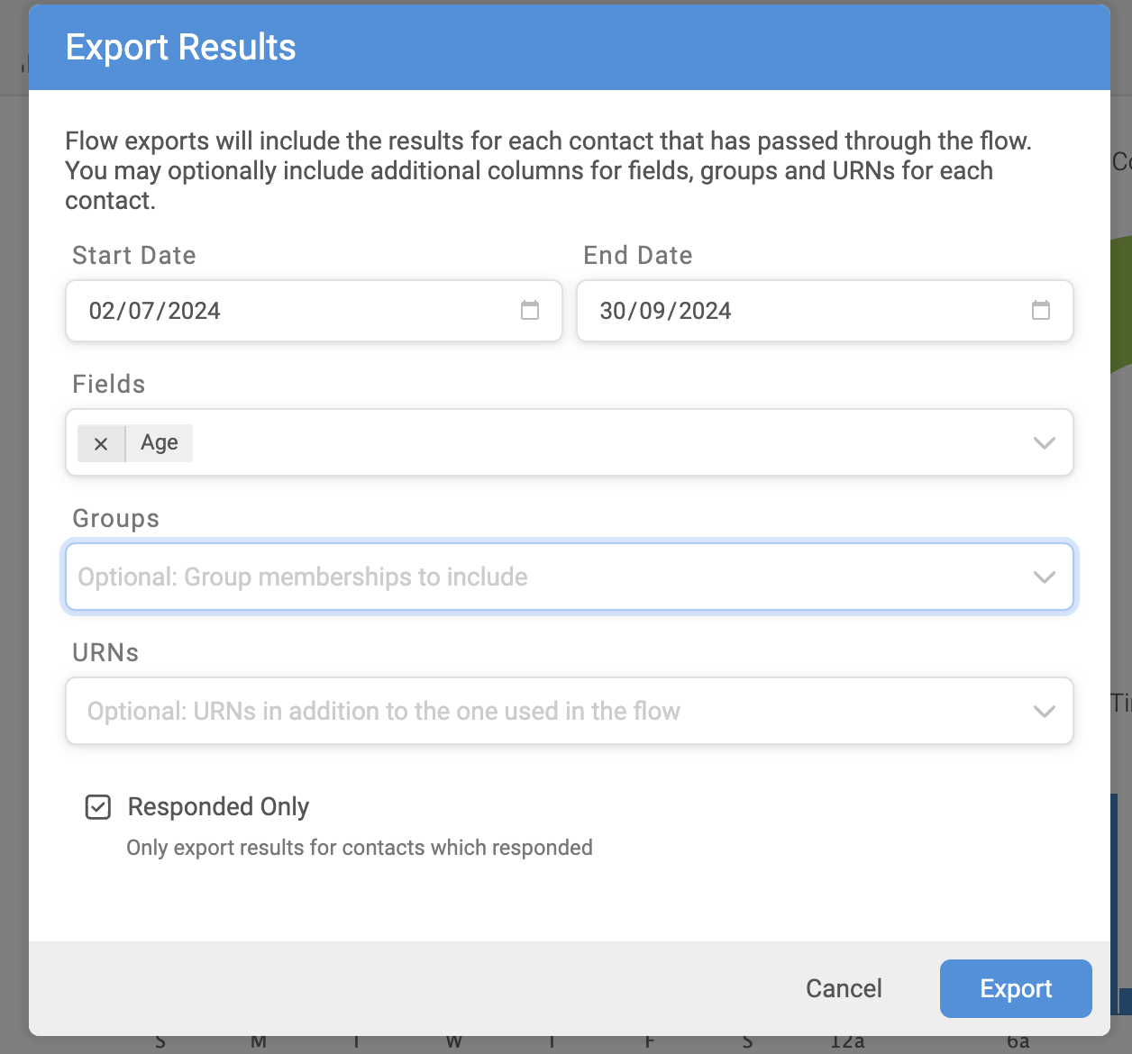 Next, click on download icon at the top of the list and choose the data you'd like to include in the export. These options include group memberships, contact fields, extra URNs, and only exporting the results for contacts who responded: