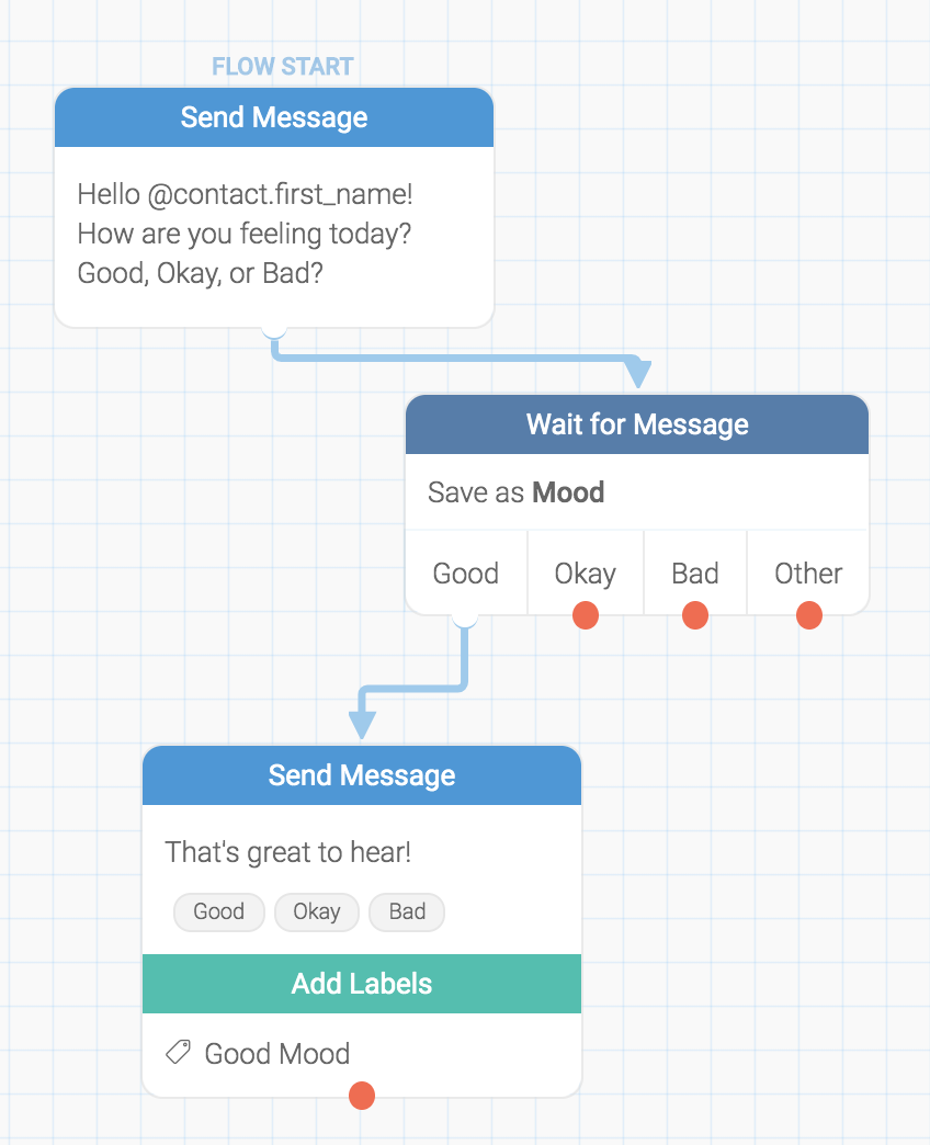 Adding a Label an Incoming Message action after the Wait for Message action pictured above allows you to filter responses that pass through a particular category. In the example pictured above, we've placed an Add Label action in a branch that stems from the "Good" category. Accordingly, only responses that are registered as "Good" will be labeled. You can then view these messages by navigating to the "Messages" tab and click the "Good Mood" label.