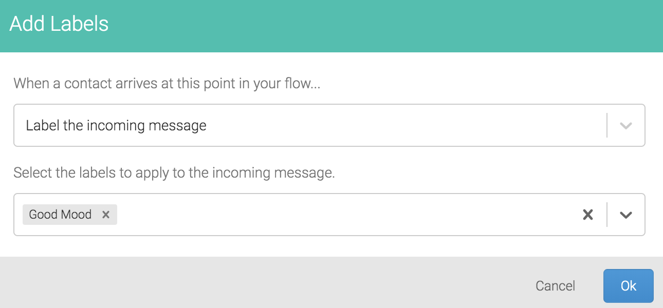 Adding a label is as simple as creating the node in your flow. You may choose an existing label, or create a new one via the Label an Incoming Message dialogue: