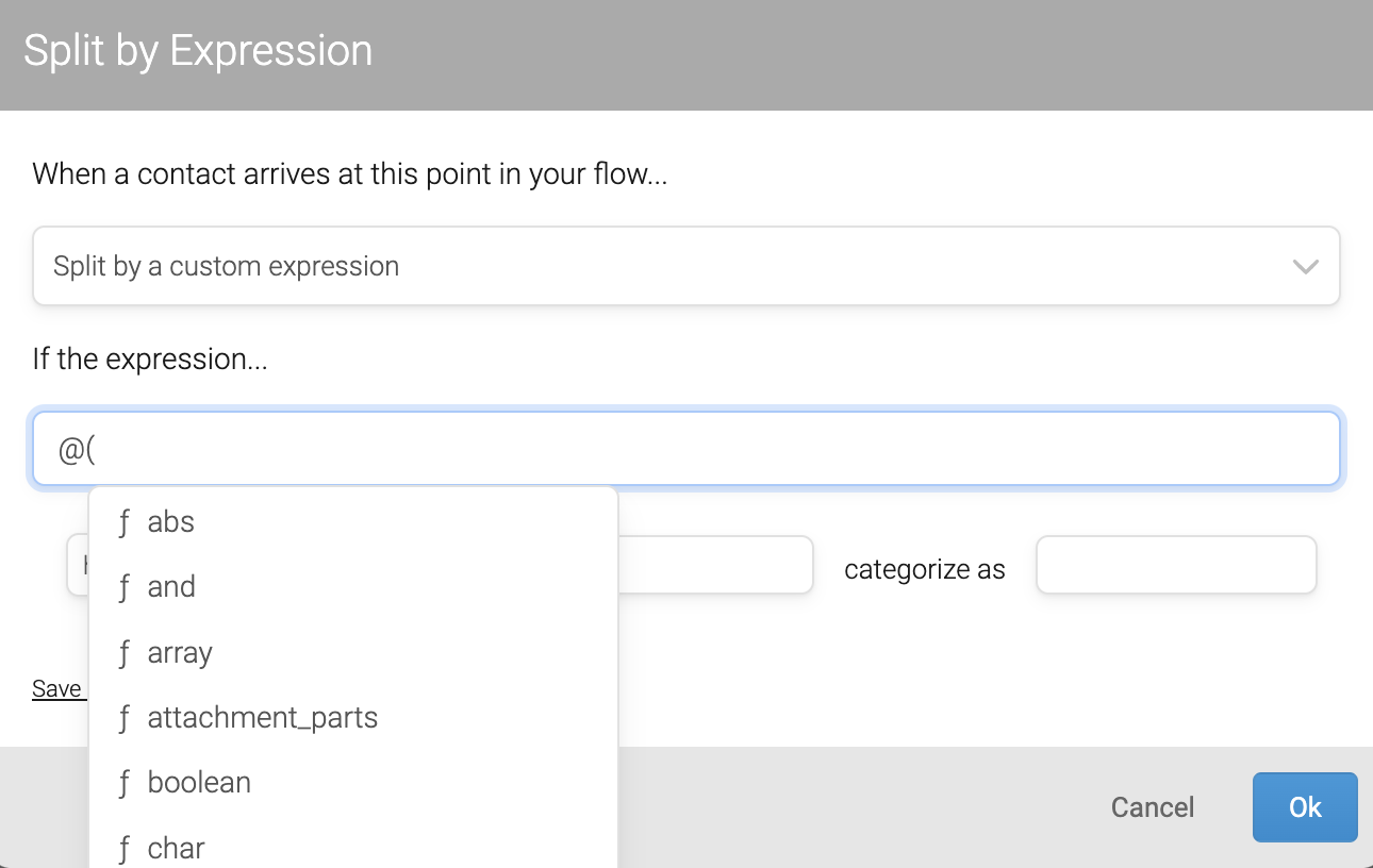 All expressions begin with an "@" symbol and an open parenthesis, e.g. @(now() or @(time_from_parts() Once entered, @( will trigger a completion dialogue that lists and explains each function: